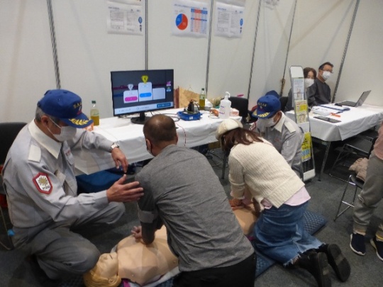 令和7年3月2日(日)小雨の降る中、健康さかい21健康フェアにて、消防局との協働による市民向けブースを出店しました。